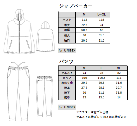 ※裏起毛生地はパーカー上身頃、パンツ本体部分で使用