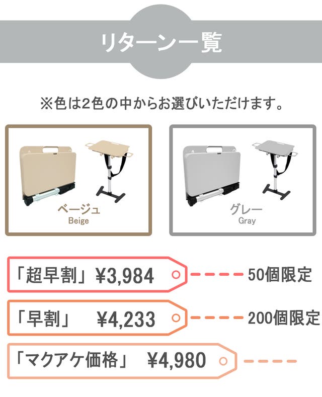「Makuake(マクアケ)」は、実行者の想いを応援購入によって実現するアタラシイものやサービスのプラットフォームです。このページは、 プロダクトカテゴリの 「15秒で簡単組み立て!コンパクトに持ち運べる組立テーブル「スポテーブル」」プロジェクト詳細ページです。