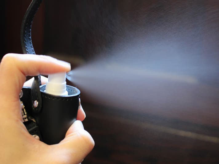 スプレーボトルのキャップとレザーケースのフラップの2重構造でスプレーをロックしています。