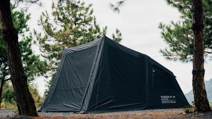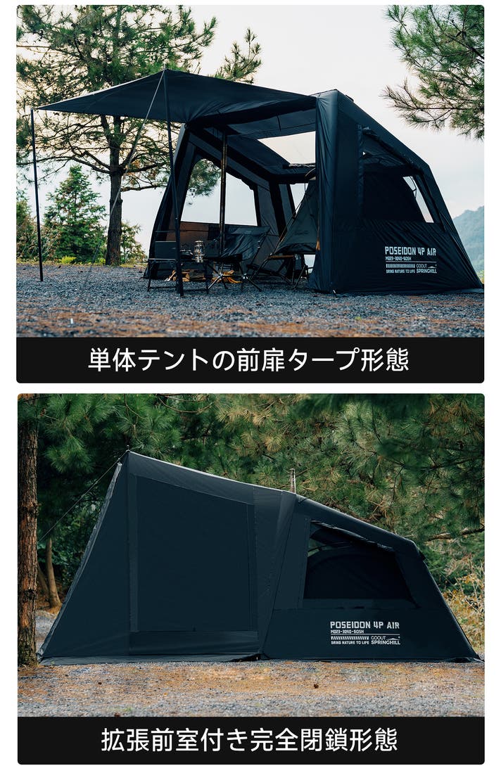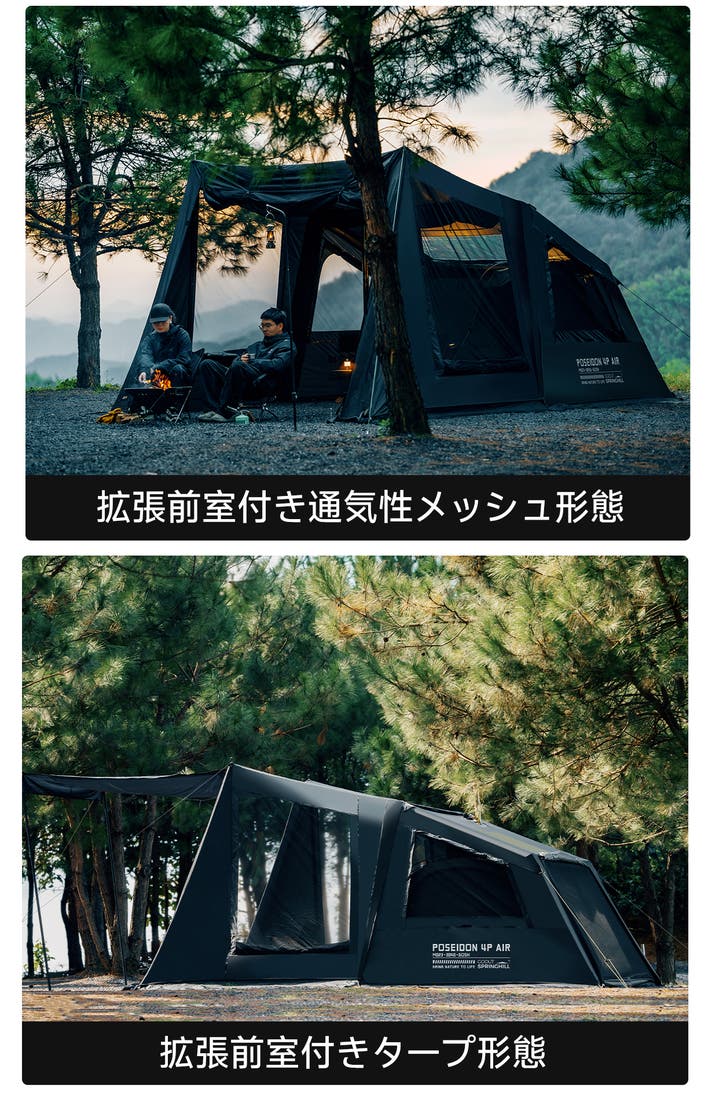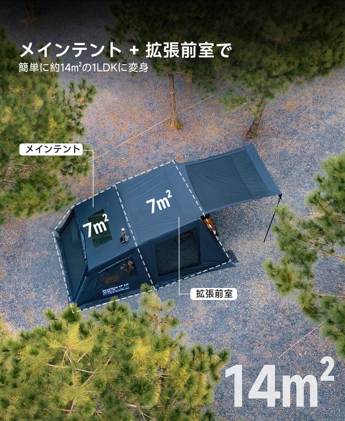 A4:このテントは、4人以上が快適に過ごせる広さを提供します。約7㎡のメインテントに加え、拡張前室を接続することで、さらに広い約14㎡の空間を実現できます。