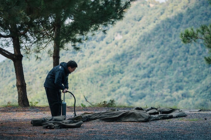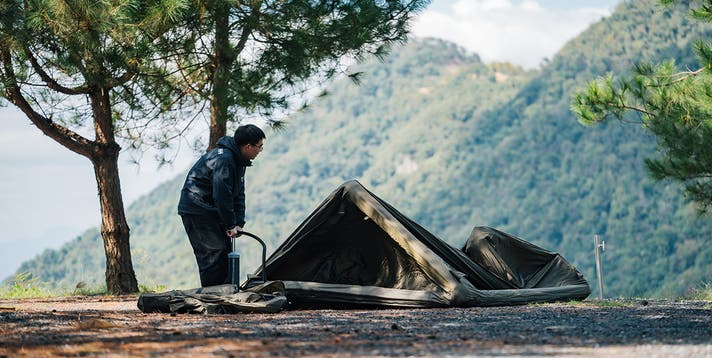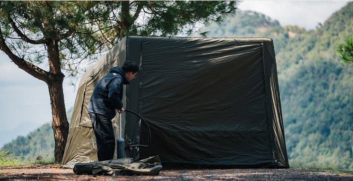 広げてポンプで膨らませるだけ。濡れずにサッと設営。