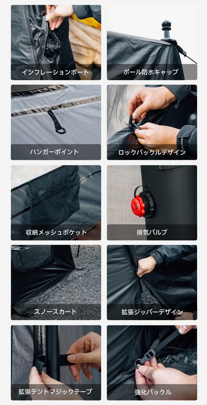 初のエアテントは多くのお客様から支持をいただき、この度、新たに開発したコンパクト設計のエアテントを発表いたします。アウトドアでも家庭でも、コンパクトなボディに込めた確かな機能性と快適さが、寒さに震えるキャンプの夜にも、くつろぎのホームシーンにも、新たな体験をお届けします。