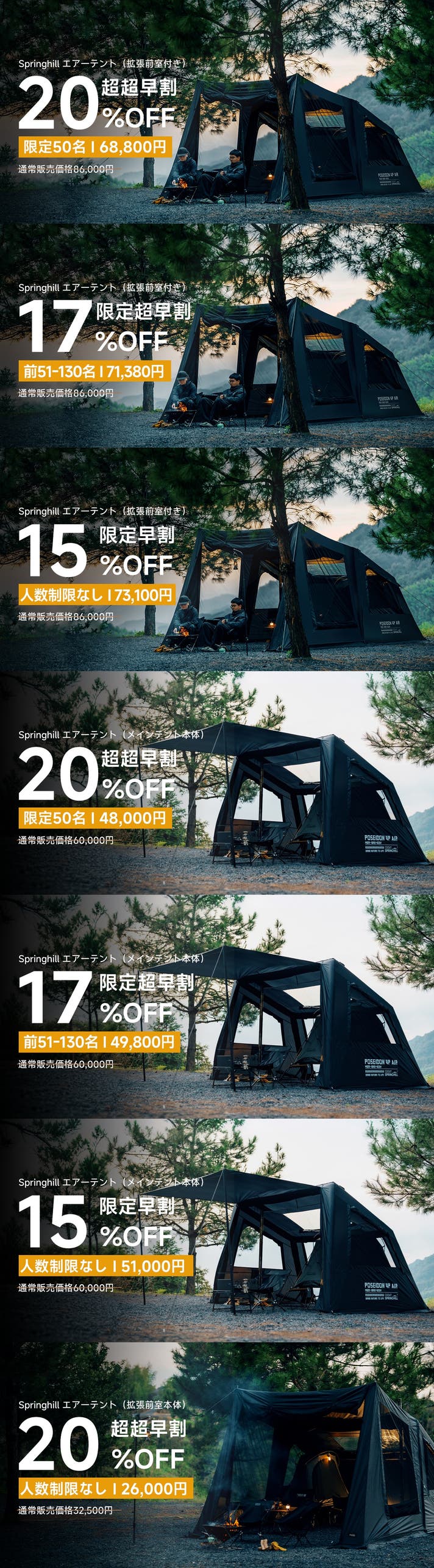 「Makuake(マクアケ)」は、実行者の想いを応援購入によって実現するアタラシイものやサービスのプラットフォームです。このページは、 プロダクトカテゴリの 「Springhillエアーテント|圧倒的スピード設営×四季も快適1LDK空間!」プロジェクト詳細ページです。