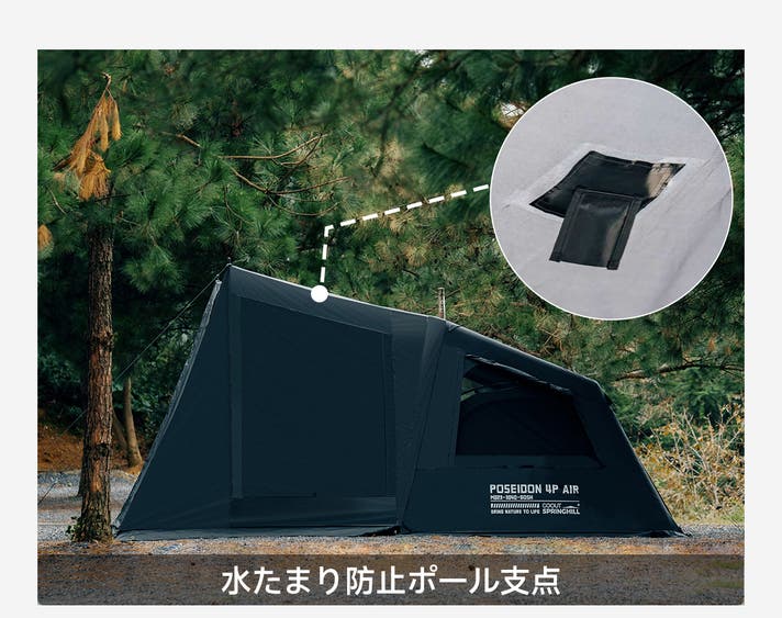 PVCエアポールを使用。強度が高く耐久性も抜群です。手動ポンプで簡単に立ち上がり、組み立て中の位置調整も簡単。