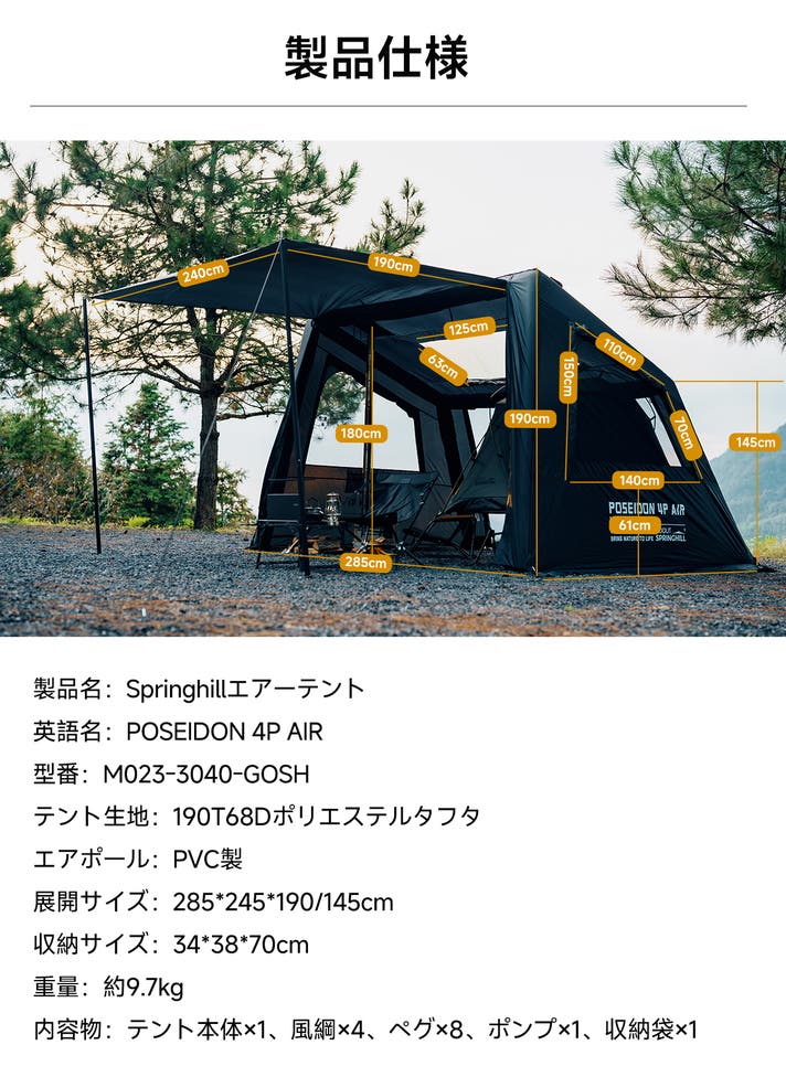 A1:このインフレータブルテントは、付属の高圧ポンプを使用して、わずか120秒で設営が完了します。他の工具は不要で、開封後すぐに使用可能です。