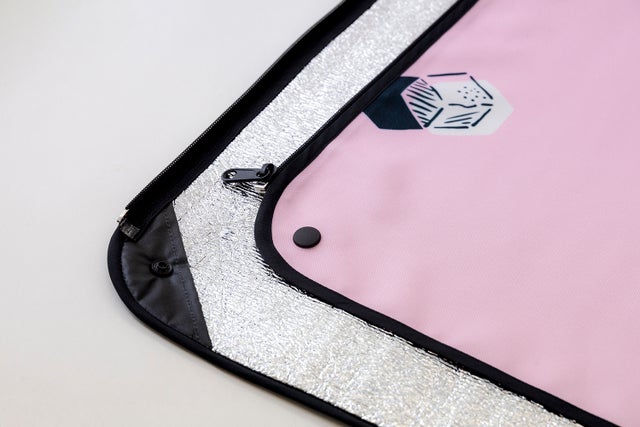 底面にはアルミ蒸着フィルムを使用しています。クッション性と子どもでもラクラク運べる軽さとのバランスを考えてたどり着いたのは、厚さ3mmでした。アルミ蒸着フィルムは、劣化防止の包装袋や機能性カーテンなどに使われる断熱性や保温性に優れた特殊な素材。アスファルトの熱や冷たさを遮断するのでどこでも快適に過ごせます。もちろん撥水加工付き。