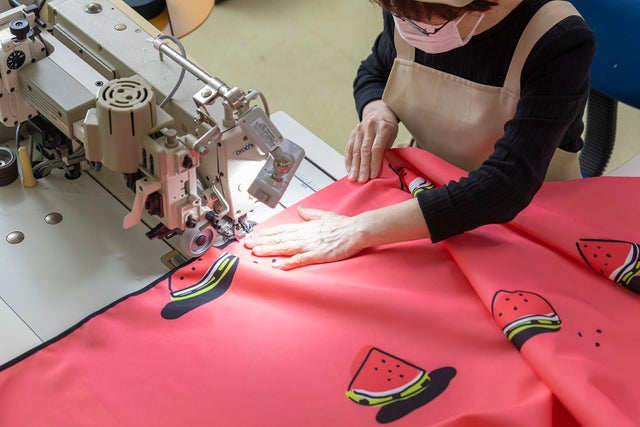 布への鮮やかなプリントと、高い縫製技術を併せ持つ創業60年のカーテンメーカー「KAZUMA」と、遊び心あるデザインが特徴のaiMIKI(アイミキ)の初めてのコラボ商品が誕生しました。