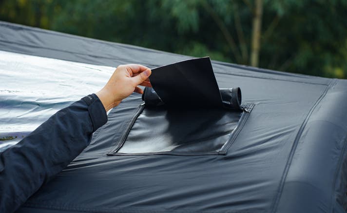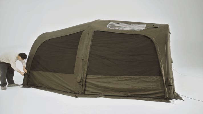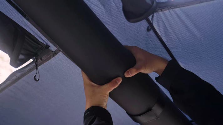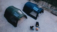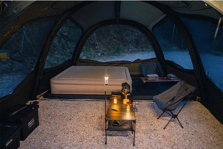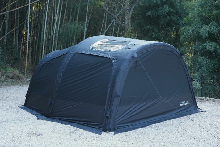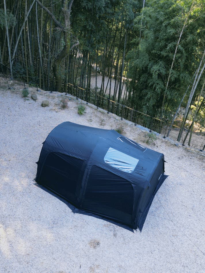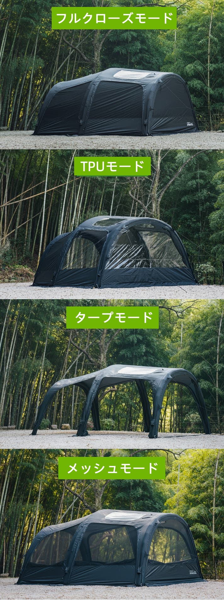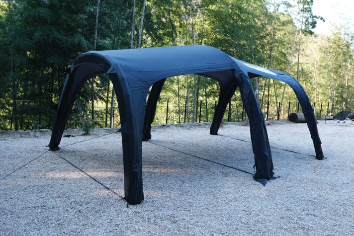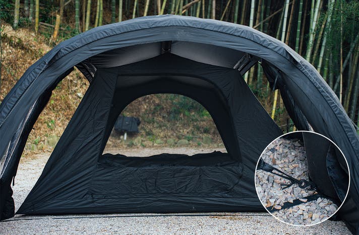 - ポンプで空気を入れるだけの簡単設営、150秒でテントが立ち上がるエアフレーム構造。
