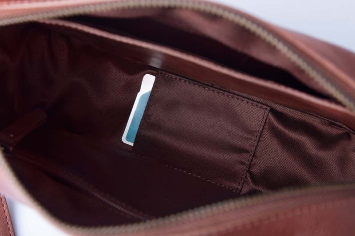 バッグの底に隠された専用カードポケットに、交通系ICやクレジットカードをセットすれば、改札もコンビニもワンアクションで決済完了。