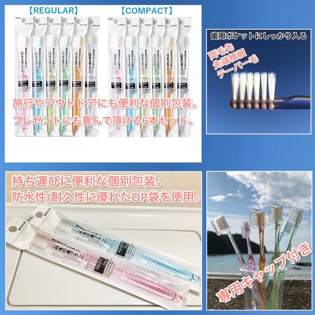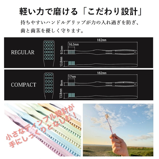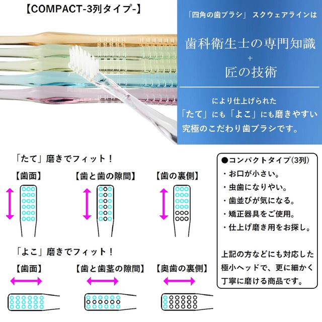 ・COMPACT (3列タイプ)は、お口の小さな方、虫歯になりやすい方、歯並びが気になる方や矯正器具をご使用の方などにも対応した極小ヘッドで、更に細かく丁寧に磨ける商品となっております。