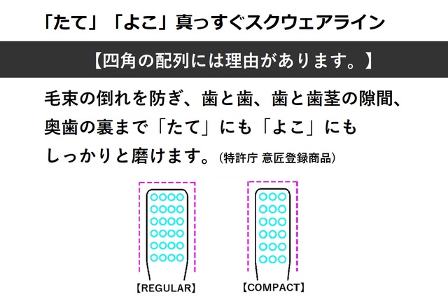 - 毛の倒れを防ぎ、「たて」にも「よこ」にもしっかり磨ける【四角の配列】(特許庁 意匠登録商品)