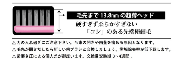 - 歯と歯、歯と歯茎の隙間の歯垢を隅々まで除去する「コシ」のある、両毛先 先端極細テーパー毛!