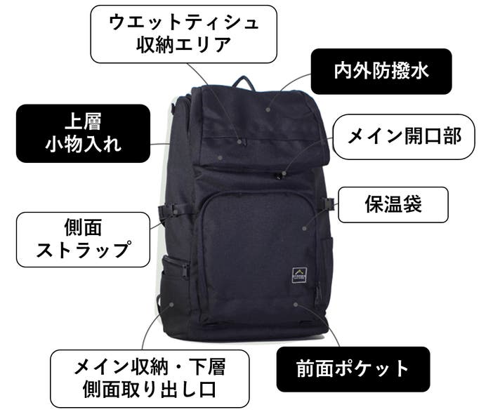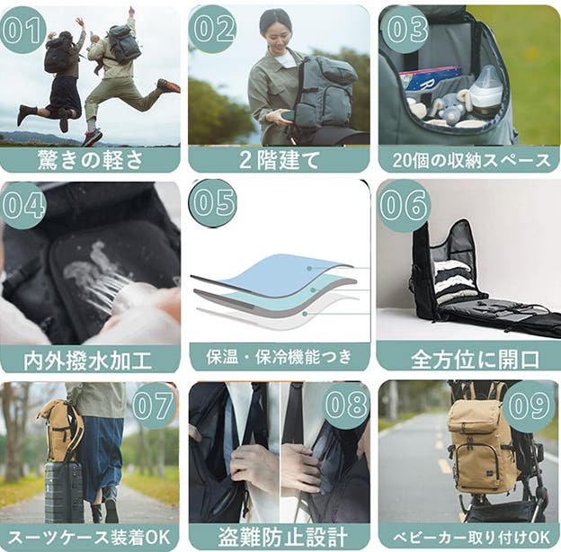 A: 背面に3D立体構造のパッドを採用し、重量を肩・背中・腰に均等に分散させる設計です。長時間背負っても重さを感じにくく、育児中の親御さんの身体的負担を軽減します。