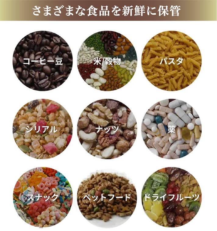 コーヒー豆だけでなく、スナック菓子、シリアル、パスタ、ナッツ、香辛料、砂糖、ペットの餌など乾燥したら味が落ちてしまう食材を入れておいしさを長続きさせましょう!