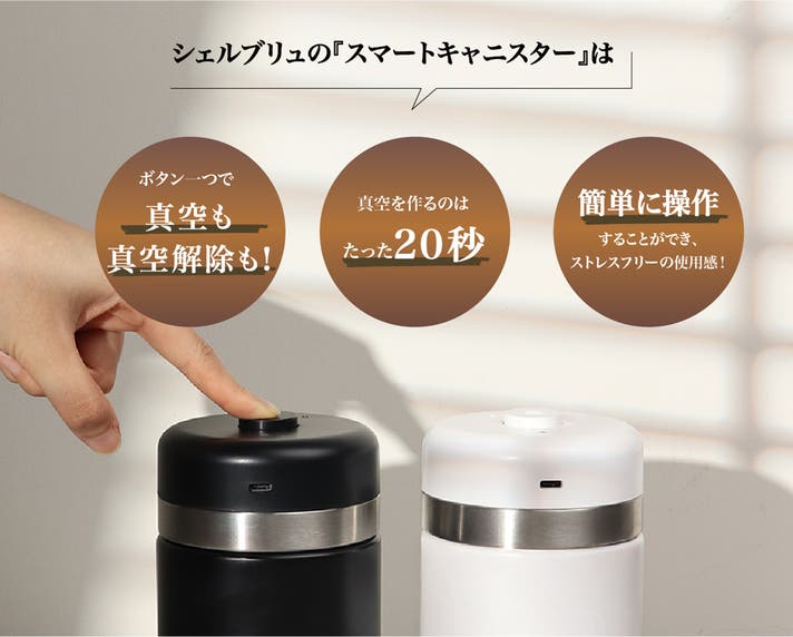 シェルブリュの『スマートキャニスター』はボタン一つで真空も真空解除もできます。