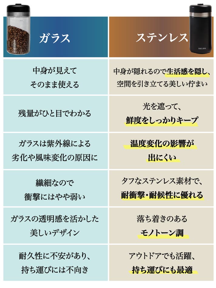 A. コーヒーパウダーや粉状の食品も保存できます。コーヒーパウダーの場合、室温で保存すると味や香りがより速く劣化するため、シェルブリュ『スマートキャニスター』に保存するとより効果があります。