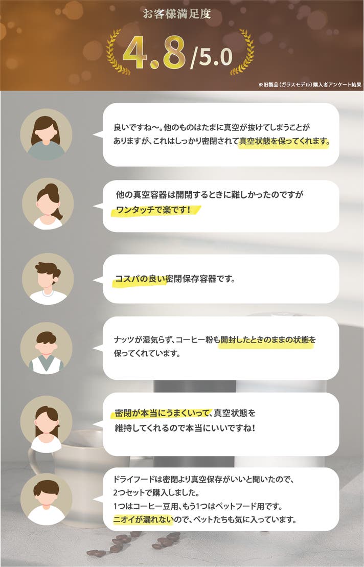 そのため、常に強力真空の状態を維持しコーヒー豆や中の食材が常に新鮮に保たれます。
