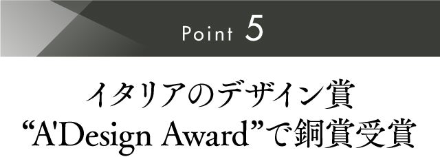 - 世界最大級を誇るイタリアのデザインコンベンション“A'Design Award”で銅賞受賞。