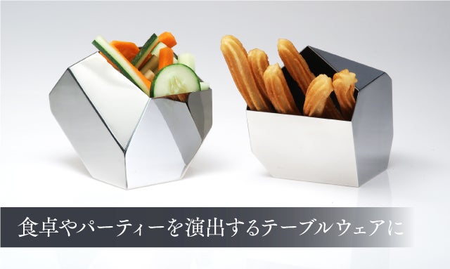 【ステンレスポリゴンボウル】は高品質なステンレスをアシメトリーなポリゴン(多面体)でデザインしたシンプルモダンのテーブルウェア。