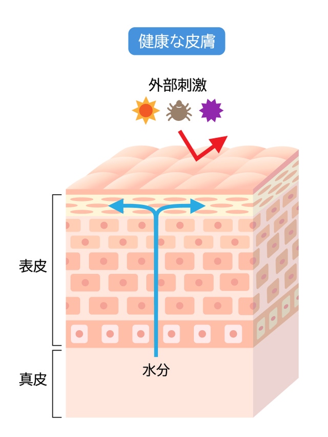 お肌が荒れる原因の一つにお肌の表面を潤いの膜で守ってくれている「バリア機能」が関係します。皮膚には多くの働きがありますが、その中でも重要なのがこの「バリア機能」。バリア機能はお肌を保護し、水分の蒸発なども防ぐ役割があります。バリア機能は、私たちのお肌を健やかに保つために、とても大切な役割を担っています。