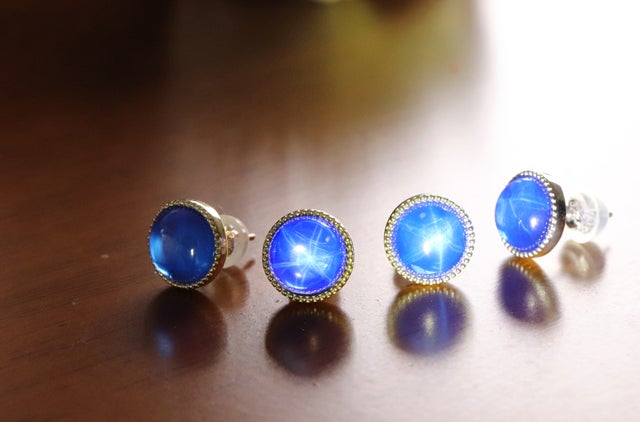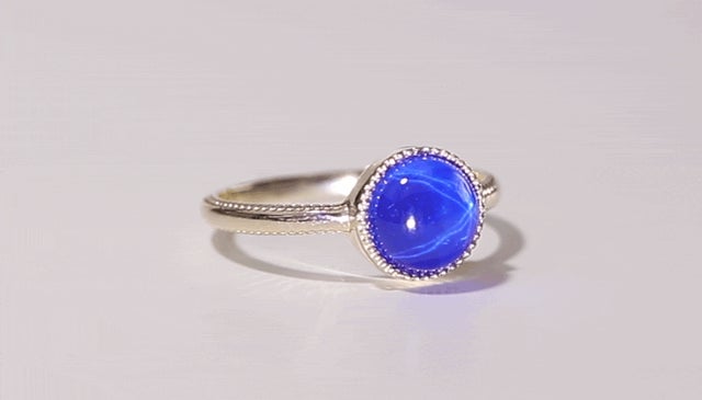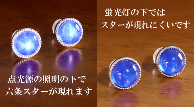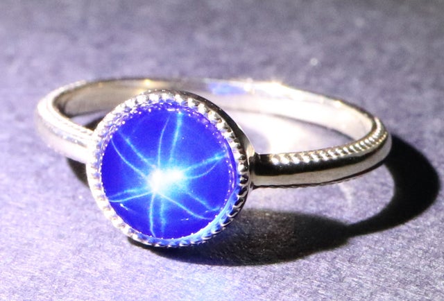 サファイアにペンライトなどの光を当てると、白い六条の光が見える特別な光り方をする宝石「ブルースターサファイア」は、アステリズム(スター効果)を見せる宝石でとても美しいスター石です。