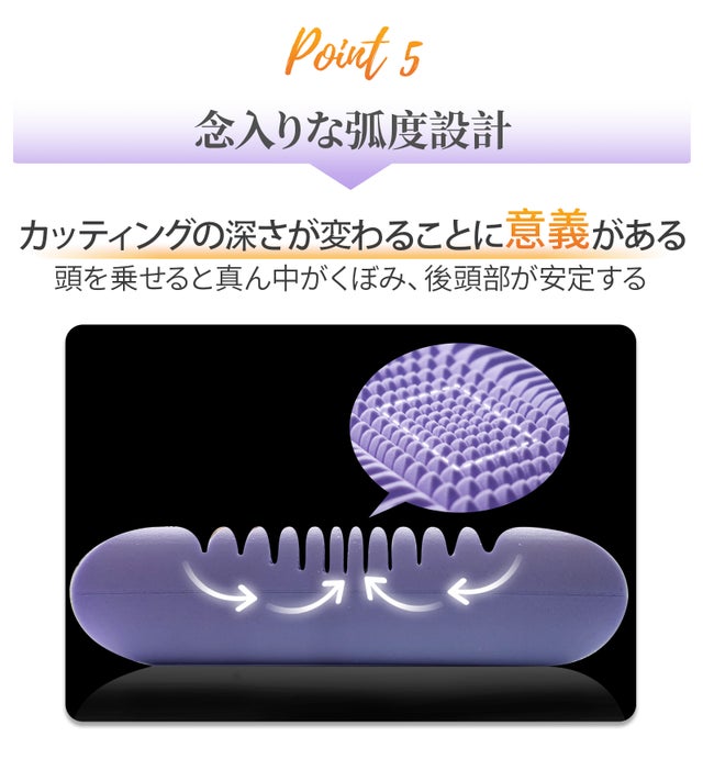 両端から中央へ流れる円滑なラインが美しいシルエットの上、機能性もあります。サポート力も両端から中央へ徐々に弱くなります。従い、後頭部の上乗せる部分が凹み、頚椎が自然なカーブになり、寝姿勢が正しく固定します。