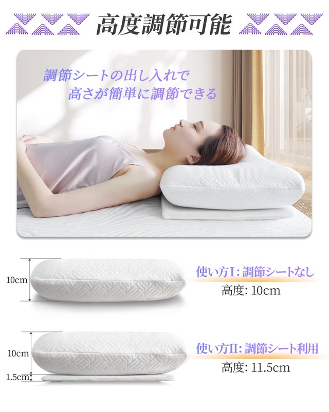 - 肌馴染のよいひんやり冷感カバー装着、高さ調節シート付きで幅広く対応できる、快眠の条件が整う枕