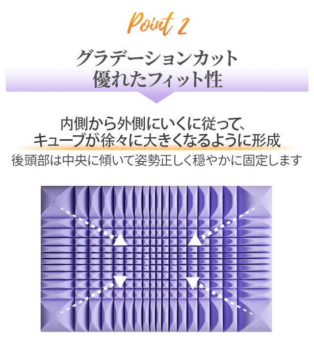 真ん中のキューブが一番小さく細く、外に行くに従って徐々に大きく太くなるように形成されています。頭を置くと、中央が自然と沈み込み穏やかに包み込まれます。
