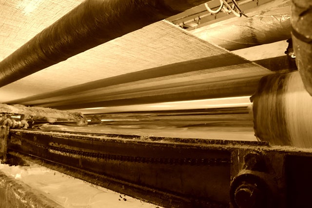 基布のままでは裏側に糸が見えているままなので基布と不織布を貼り付けていきます。