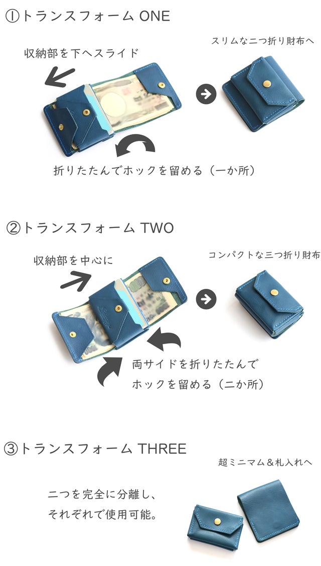 『トランスフォームする財布』とは、複数の財布を使い分けるのではなく、ひとつの財布をスリムな二つ折り、コンパクトな三つ折り、更にはセパレート(分離)して超ミニマム&札入れへと「変身出来る財布」です。