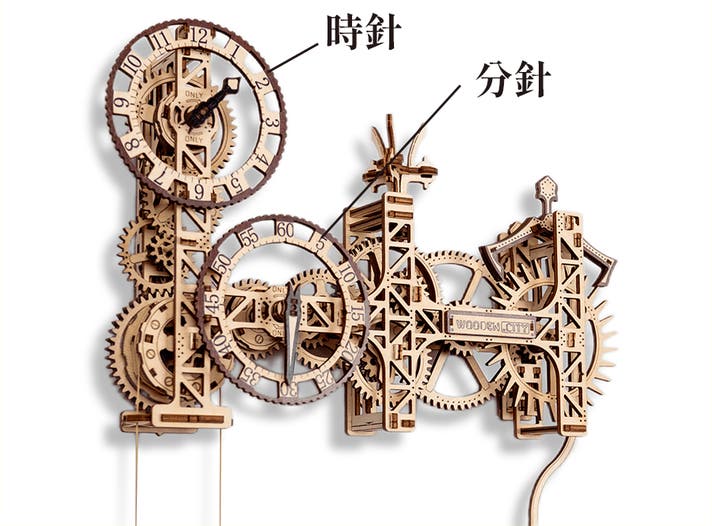 この時計は電池を使わず、重りの重力と精密な歯車によって動作します。
