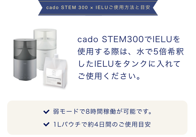 cado加湿器STEM300 + IELUパウチ1L ×10 空間噴霧セットを