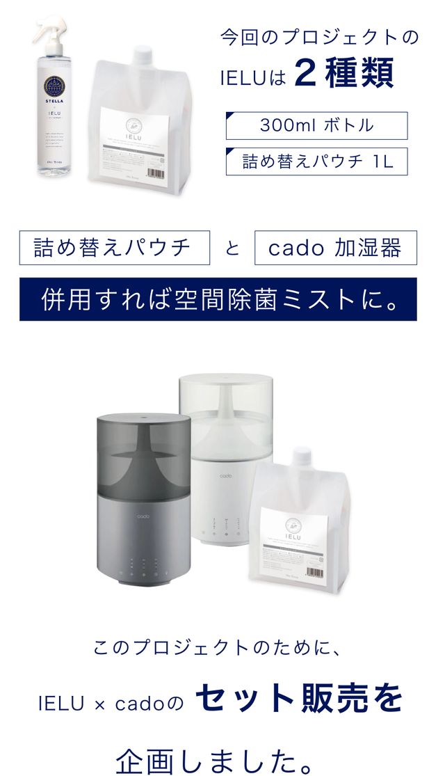 たくさんの方々にご使用いただきたいので、ご支援いただきやすいプロジェクト価格でSTELLA×IELUをご提供いたします。ボトル単品・ボトルセット・IELUを超音波ミストとして使用できる加湿器「cado (カドー)」とのお得なセットなど、幅広いリターンをご用意いたしました。
