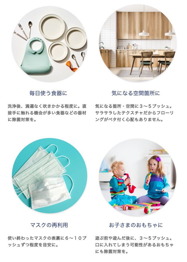 - 自宅、バッグの中に、オフィスに置いて日常の様々なシーンで除菌。0歳児にも使えます!