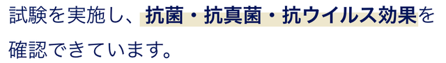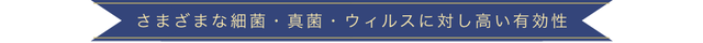細菌・真菌・ウイルスに対し、アルコールに耐性を持つものも含めて高い除去効果が確認されています。