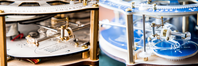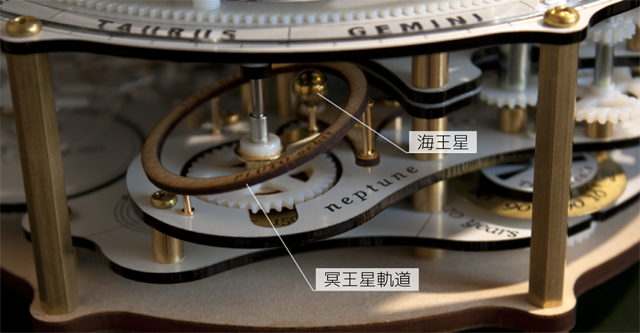 惑星が公転する黄道面を立体化しているので、内部の歯車機構がよく見えるデザインになっています。