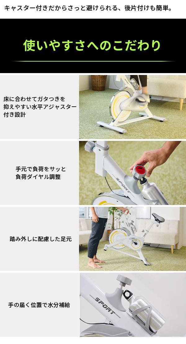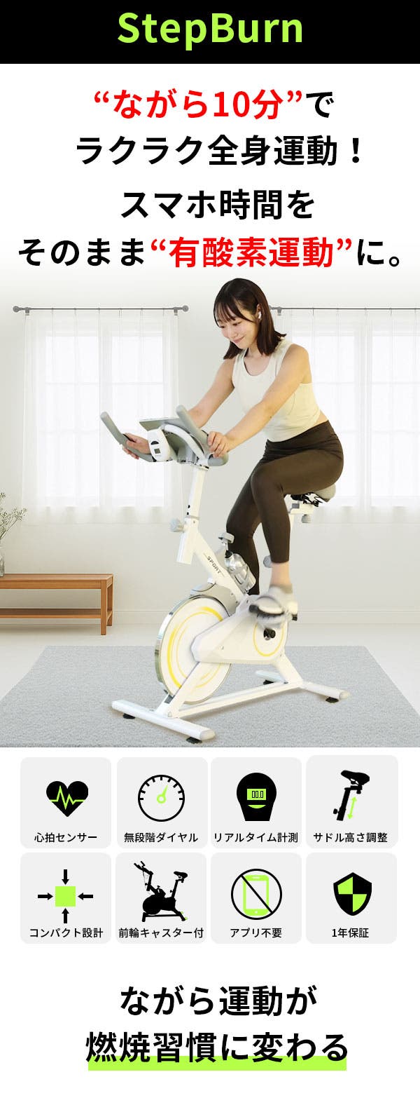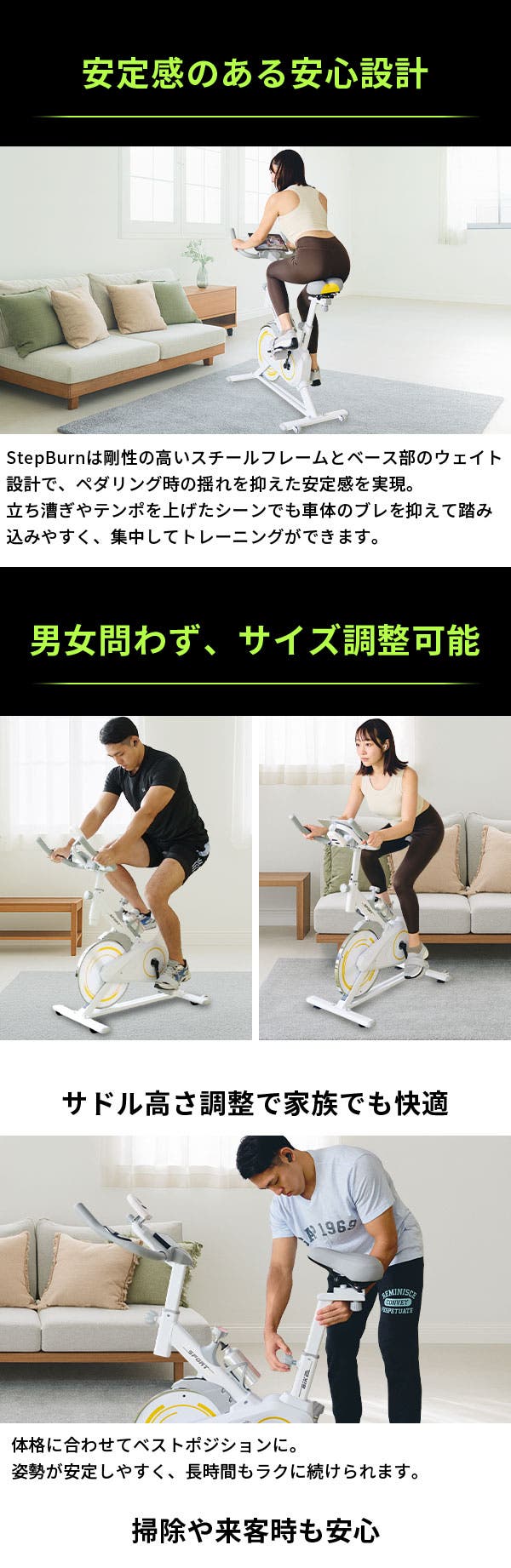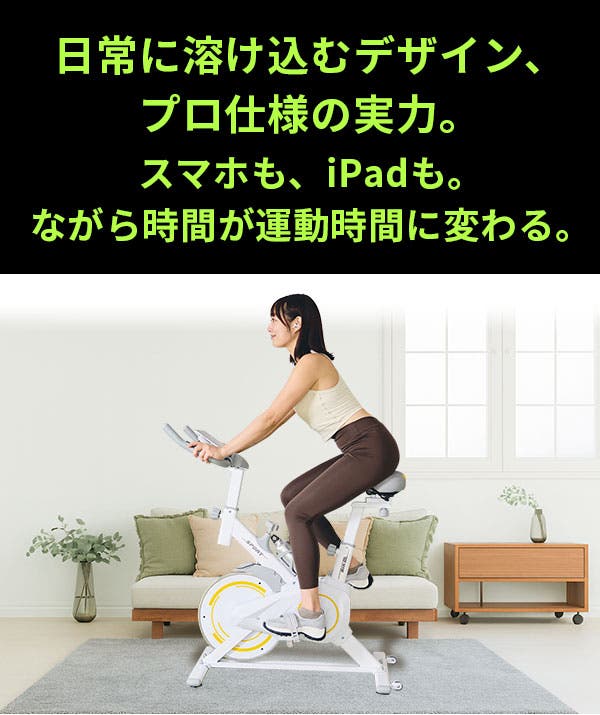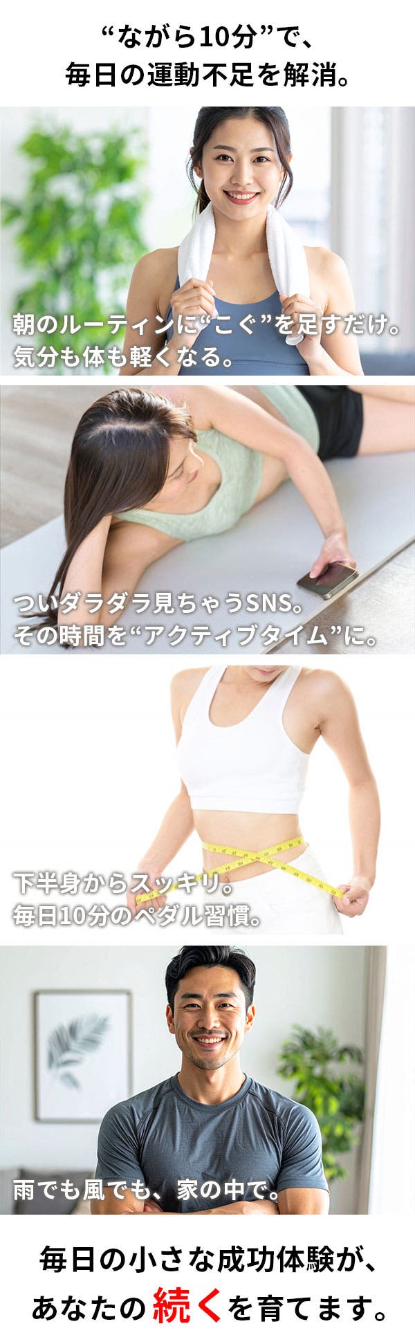 出し入れしやすいキャスター、進捗が一目でわかる回数・時間・心拍・カロリー表示、家族で使いやすいサドル調整、そしてアプリ連携不要のシンプル設計。リビングに置いたまま、思い立ったら10分から有酸素運動を始められます。