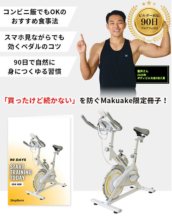 「Makuake(マクアケ)」は、実行者の想いを応援購入によって実現するアタラシイものやサービスのプラットフォームです。このページは、 プロダクトカテゴリの 「在宅で運動不足を解消!自宅で続けやすいエアロバイクトレーニングStepBurn」プロジェクト詳細ページです。