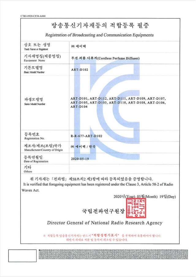 韓国内での生活化学薬品およびKC承認を受けた製品です。信頼できる電子式ディフューザーです。