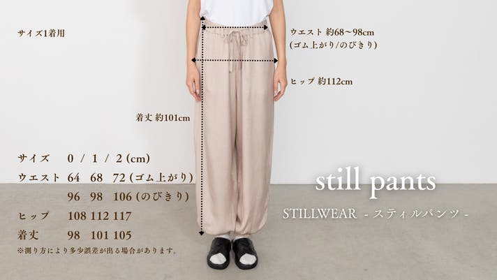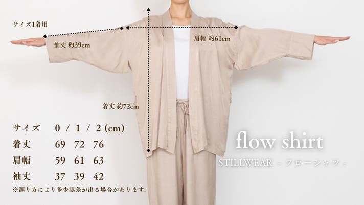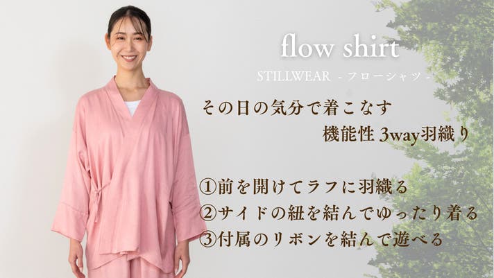 セットアップ、もしくはフローシャツとスティルパンツそれぞれ単体でもお選びいただけます。