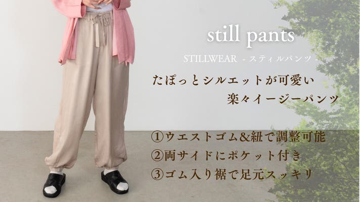 ウエスト総ゴム仕様のイージーパンツでやみつきになる履き心地