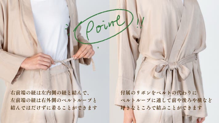 キュプラとレーヨンのやわらかな落ち感が身体の動きに自然に沿い、「和」の羽織りのようなシルエットは、着ているだけでほっと一息できるような着心地に。