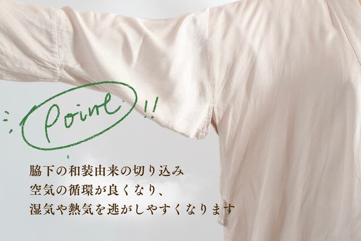 風の通るデザイン、脇を開けて着心地の良いシルエットを追求した結果、古来日本からある作務衣のシルエットへと辿り着きました。