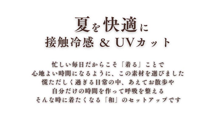 - 速乾性、接触冷感、UVカットを兼ね揃えて、Tシャツと着こなせる和を楽しむセットアップウェア