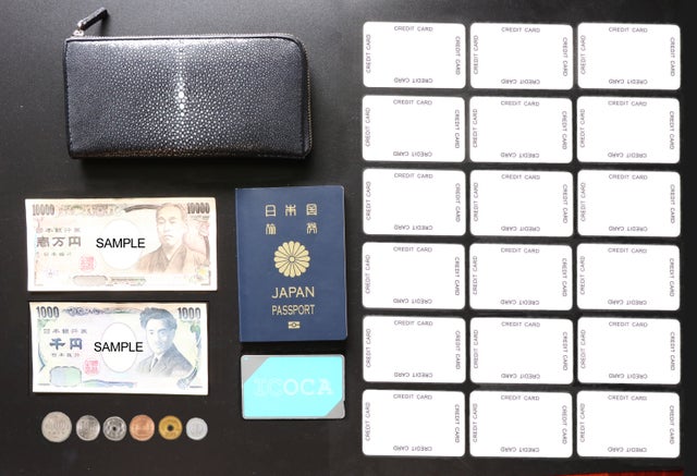 紙幣 約20枚, 硬貨 約15枚, パスポート1冊,
