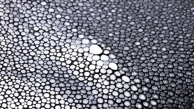 エイ革のガラスビーズのような突起の正体は『リン酸カルシウム』。私たちの歯の成分と同じです。そのため、エイ革は非常に硬く、高い強度を誇ります。