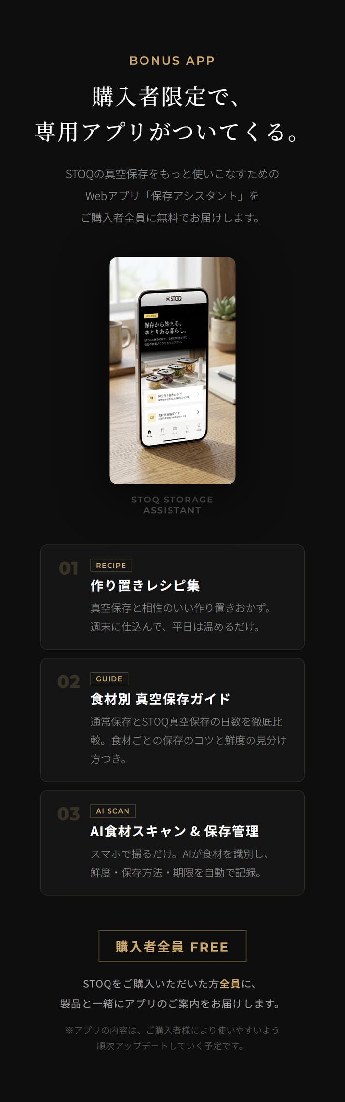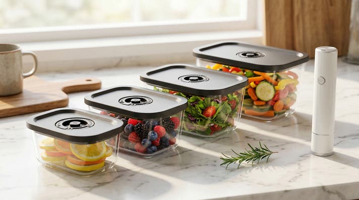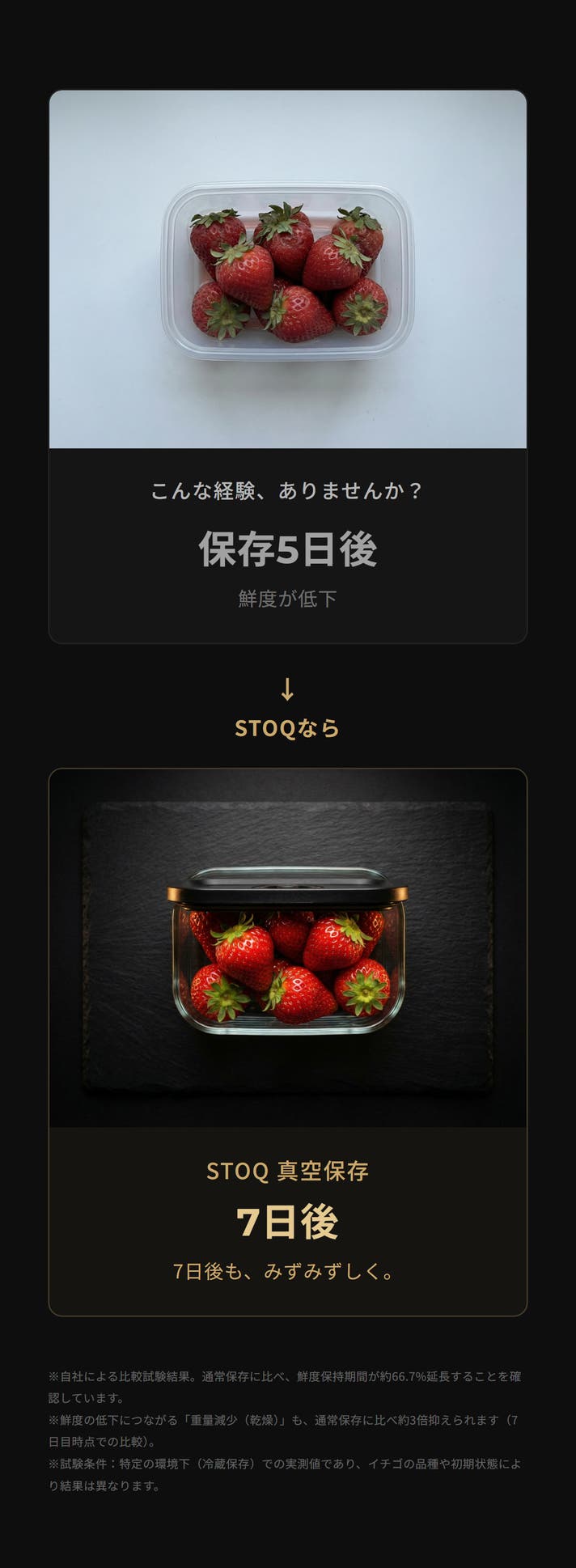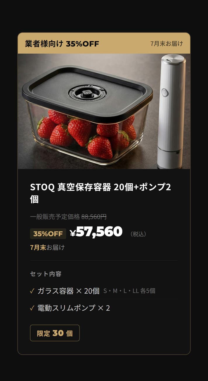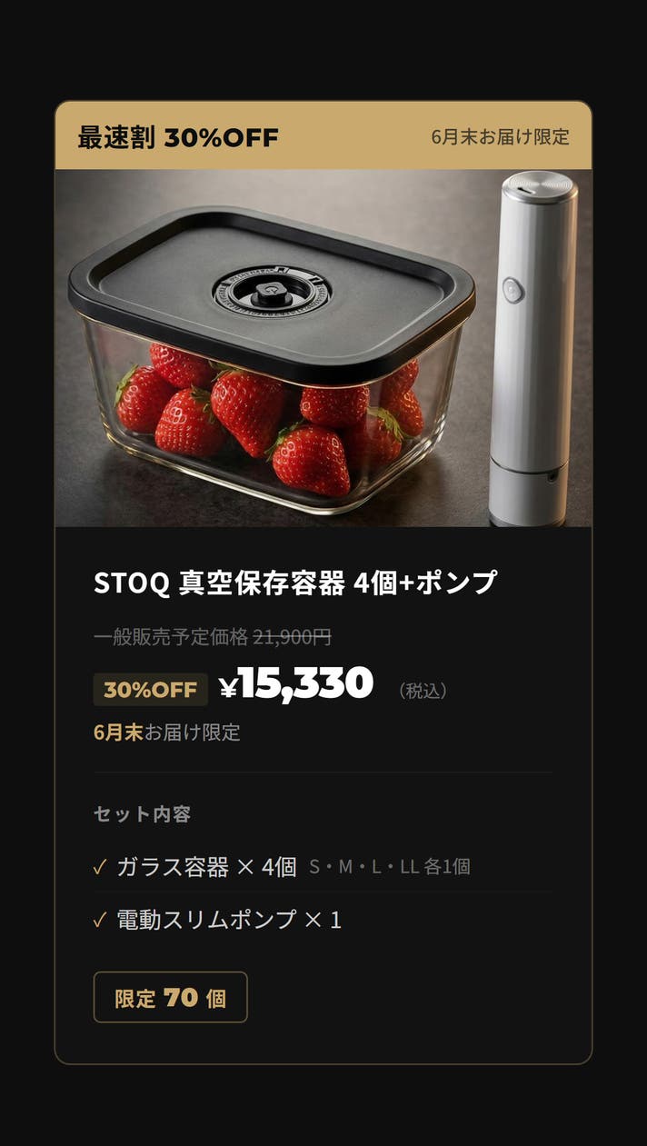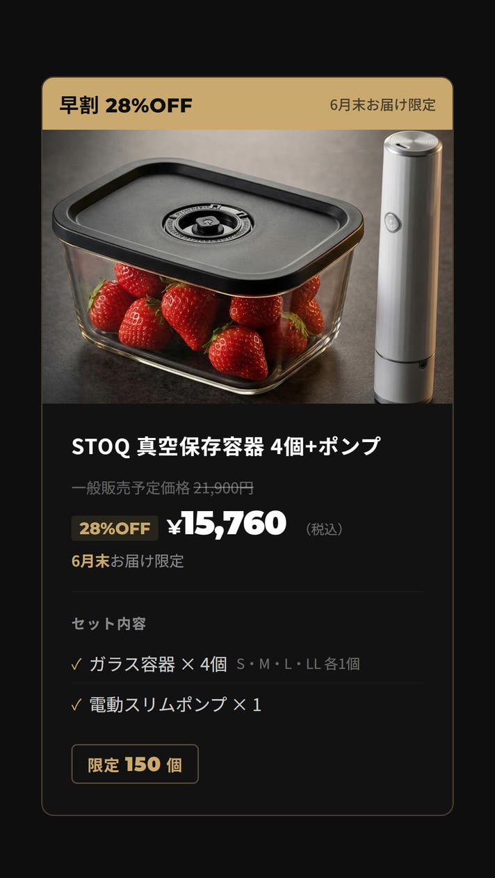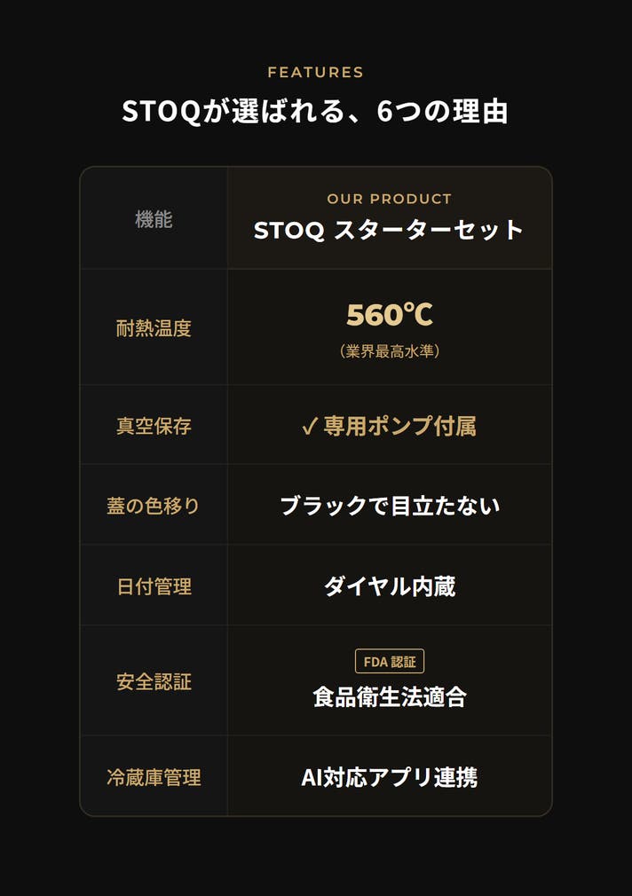 まとめて作った料理が、何日たってもおいしいまま。冷凍庫からオーブンへ、移し替えなし。洗い物も増えない。耐熱560℃ガラスと真空密封が、それを可能にします。 STOQ(ストキュー)は、あなたのキッチンをホテルのように美しく変える、プレミアム真空保存システムです。