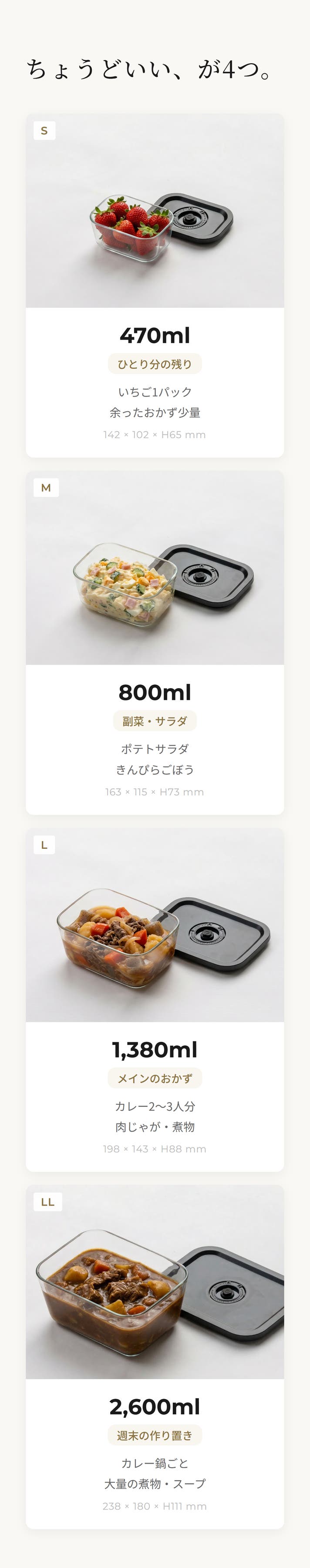 ● ガラス容器 S(470ml)● ガラス容器 M(800ml)● ガラス容器 L(1,380ml)● ガラス容器 LL(2,600ml)