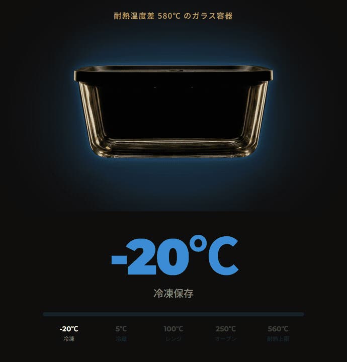 -20℃〜560℃の幅広い温度に対応する特殊なガラス(高ホウケイ酸ガラス)を使用しているため、急な温度変化でも割れにくいのが特徴です。