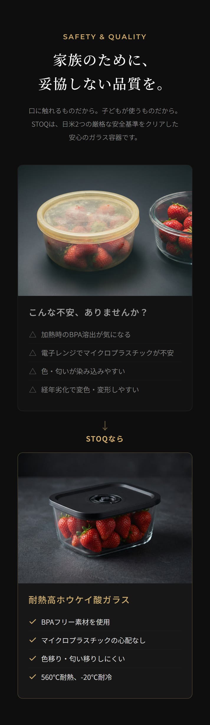それが、STOQの出発点です。家族のために毎日キッチンに立つ人に、もっと優しい道具を。その想いを、一つひとつの容器に込めました。